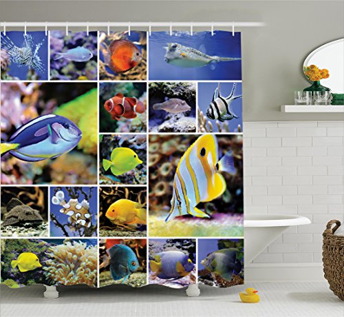 Ocean Decor Shower Curtain Set By Ambesonne, Collage Of Underwater Photos With Collection Of Tropical Fishes Decorating Art Print, Bathroom Accessories, 75 Inches Long, Blue Yellow