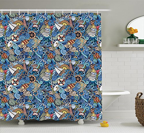 Nautical Shower Curtain Set By Ambesonne, Abstract Pattern Sea Shells Sea Horse Coral Fish Globe Maps Wavy Ocean, Bathroom Accessories, with Hooks, 69W X 70L Inches