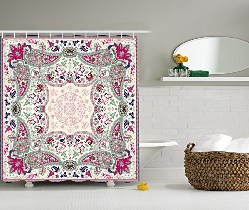 Paisley Shower Curtain Decor by Ambesonne, Damask Design Floral Ornamental Geometric and Square Print, Polyester Fabric Bathroom Shower Curtain Set with Hooks, Magenta Pink Teal Navy Blue Cream
