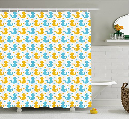 Rubber Duck Shower Curtain by Ambesonne, Baby Ducklings Pattern with Cute Little Hearts Love Animals Print Nursery Room, Fabric Bathroom Decor Set with Hooks, 70 Inches, Blue and Yellow