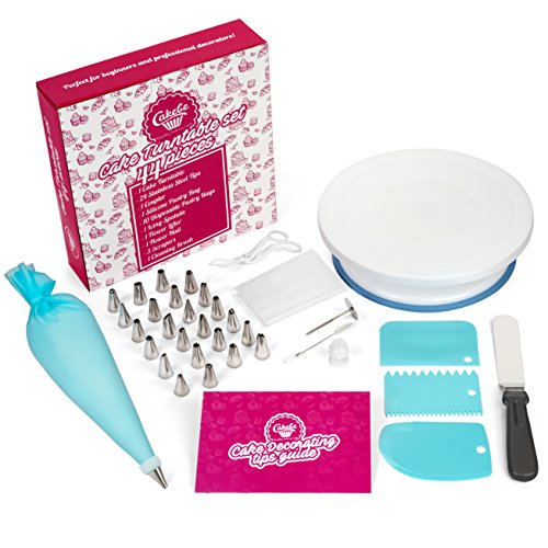 - ✅ ULTIMATE DECORATOR TOOLS No more spending your time looking for the ideal cake decorating supplies in one set! The Cakebe 44 pcs icing decorating tools kit includes the most necessary items that decorators need for perfect cake decoration rotating and revolving turntable stand, 24 stainless steel tips and nozzles, 1 coupler, 1 reusable silicone bag and 10 disposable pastry bags, flower nail and lifter scissors, 1 icing spatula, 3 scrapers, cleaning brush and helpful cake decorating guide.