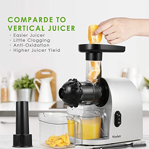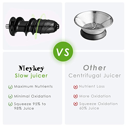 Higher Nutritional :The slow juicer that makes fruits or vegetables to keep minimal Oxidation, low heat build-up, less foaming and no clogging in speed 80 rpm /minute.Use a slow juicer to keep more nutrients (including vitamins, enzymes, minerals, trace minerals, etc.) in the juice. provide the natural taste