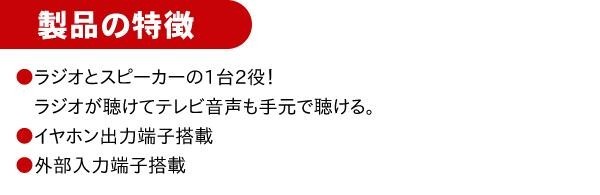 | 仕様 | 受信周波数:AM:525~1630KHz、FM:76~90MHz スピーカー出力:1W 電源:DC6V(単二形アルカリ乾電池4本・別売)、DC6V 300mA(ACアダプター別売) 電池持続時間/FM:約280時間、AM:約310時間(スピーカー使用時、単二形アルカリ乾電池を使用した場合) 出力端子:φ3.5ステレオミニジャック 入力端子:φ3.5ステレオミニジャック |