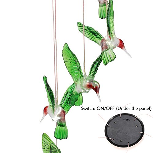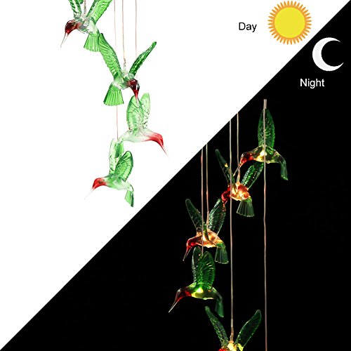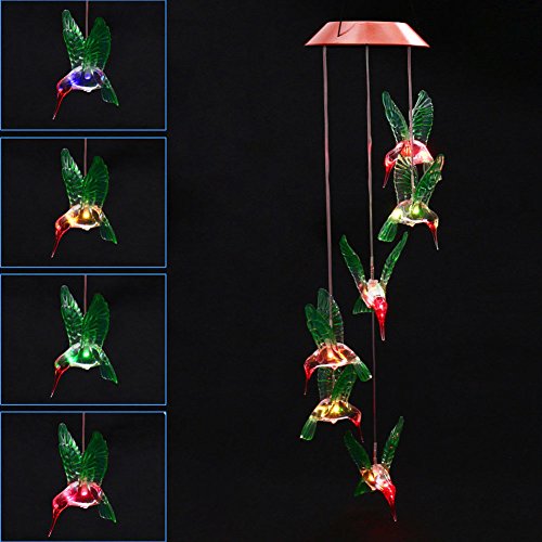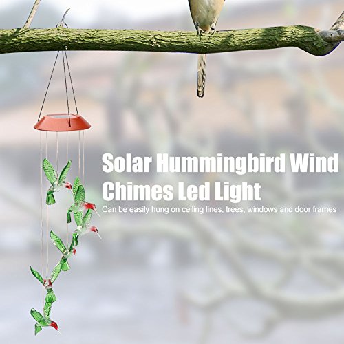 - Solor power wind chime a unique design with six color changing hummingbird hanging under the wire. The wind light could last up to 6 - 8 hours when fully charged. Plastic products, no fade, no shape change.
