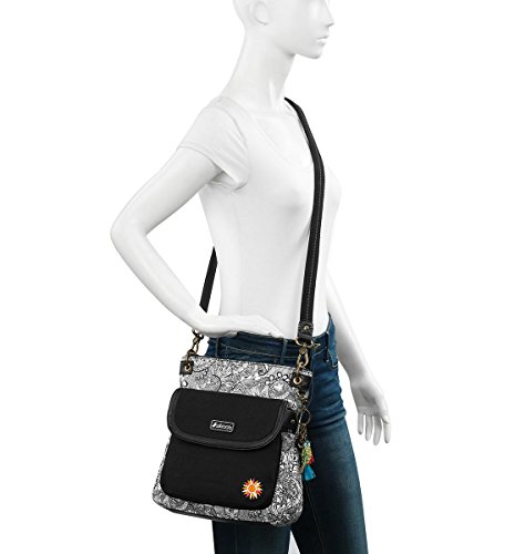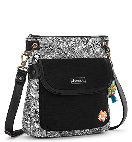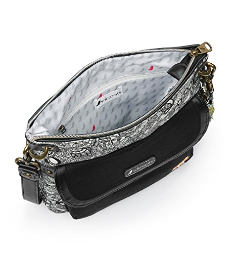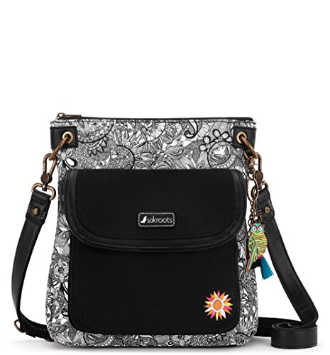 Patterned handbag featuring front flap pocket with magnetic-snap closure and logo fob