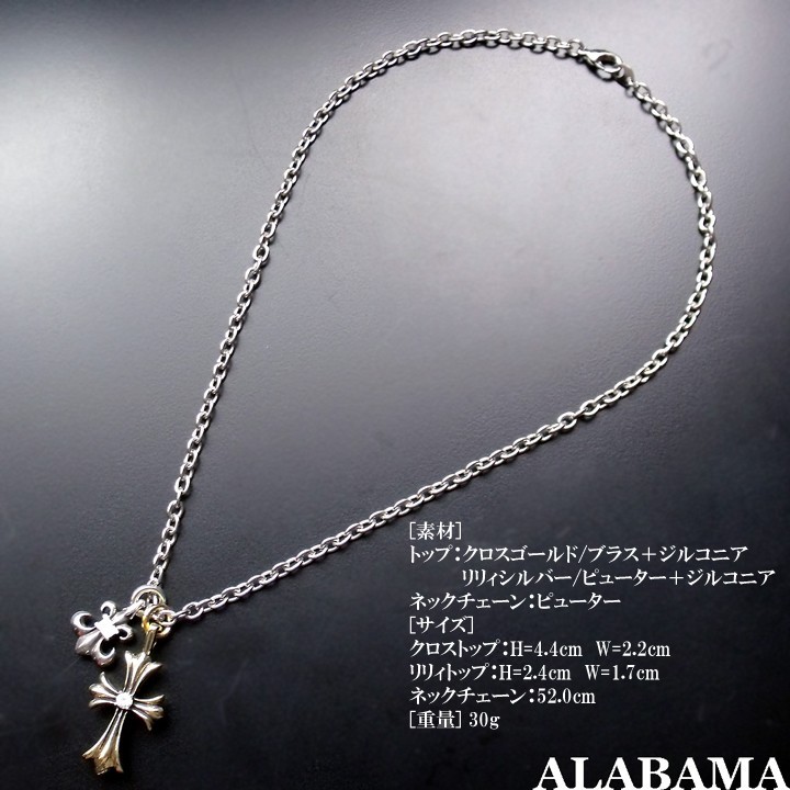 クロス&リリィ トップ ネックレス【素材】ペンダントトップ:ゴールド=ブラス製 シルバー=ピューター製 ネックチェーン:ピューター製【サイズ】ネックチェーン:約52.0cm クロストップ:H=4.4cm W=2.2cm リリィトップ:H=2.3cm W=1.7cm 【重量】約30g【仕様】詳細画像に記載してます。【Deep Zone】ワイルドでセクシーを上品にまとめる男のアクセサリーブランド。自分買いからプレゼントにも人気でオススメアイテムです。