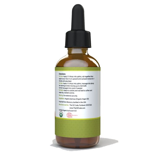 -. Feature : USDA certified moroccan argan oil (100% pure) hair, skin and face treatment; Imported from morocco, Bottled in the U.S.A / The OZ Code argan oil is produced using the highest standards in the industry; Cold pressed; Unrefined; All natural; Unscented / Apply to dry, damaged and brittle hair for a shiny celebrity feel / Apply all over body to condition, nourish and maintain healthy skin tones / Apply to face for a deep moisturizing, radiant and glamorous look