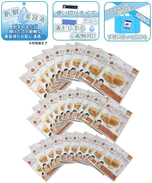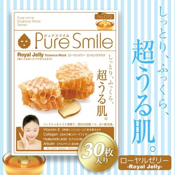 Pure Smile(ピュアスマイル)エッセンスマスクシリーズ。ローヤルゼリーエキスに、ビタミンEやコラーゲン、ヒアルロン酸Na、アルブチンなどを配合。肌にうるおいとツヤを与えます。 |