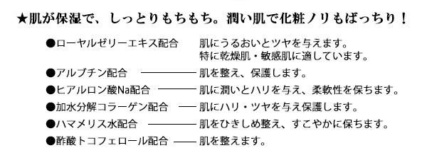 | 成分 | 水、グリセリン、PEG/PPG-17/6コポリマー、加水分解コラーゲン、エリスリトール、ナットウガム、ハマメリス水、ローヤルゼリーエキス、グリチルリチン酸2K、キサンタンガム、スベリヒユエキス、アルブチン、PEG-14M、ヒアルロン酸Na、EDTA-2Na、メチルパラベン、PEG-40水添ヒマシ油、PEG-60水添ヒマシ油、アラントイン、フェノキシエタノール、香料、酢酸トコフェロール |
