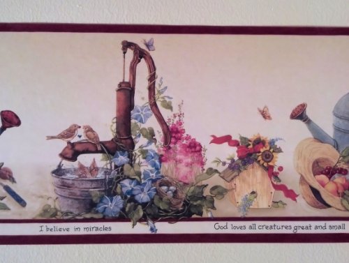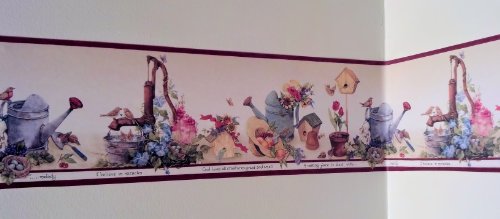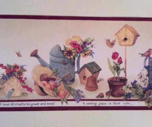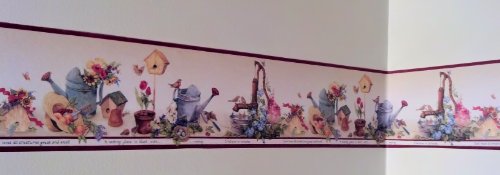 -. Feature : Wallpaper Border - 15 Foot Prepasted Spools / Pattern HRB3993 - Red Edge / Birdhouses, Gardening, Plants Flowers / Gardening Wallpaper Border / Country Wallpaper Border - 7 Inches Wide