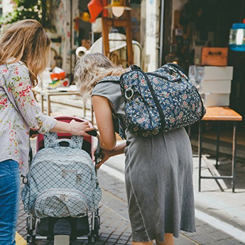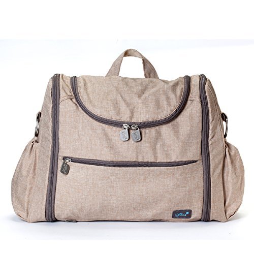 Main compartment with especially wide opening. Inner pocket suitable for a big purse. Clip for pacifier, keys, and more. Padded adjustable back straps. Removable shoulder strap. Two thermal compartments for bottles, with three insulated layers. Changing compartment at the bottom for fast, convenient diaper changing. Compartments for fresh diapers and soiled diapers. Easily-detachable, lightweight, liquid-repellent, padded changing mat. Cell phone compartment in front. Zippered mesh laundry bag. GittaGrips.