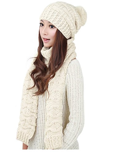 -. Title : OURS Women's Cable Knitted Beanie Cap with Pom Pom + Knitted Scarf Two Peice Set