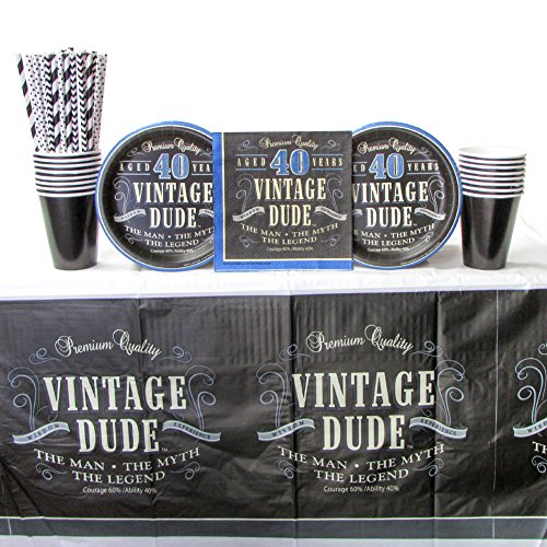 -. Title : Vintage Dude 40th Birthday Party Supplies Pack for 16 Guests Includes: Straws, Dessert Plates, Luncheon Napkins, Cups, and Tablecover (Bundle for 16)