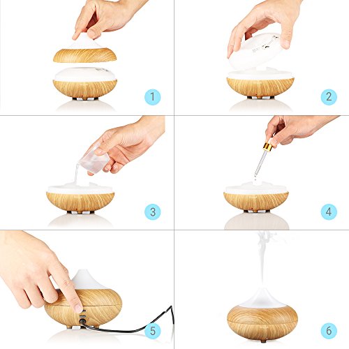 Compact Design & 7 Color Mood Lighting --- Compact design(110ml) with wood-grain finish matches almost all kinds of surroundings, without taking much space. 3 models about the light;Fixed one color steady on/7 colors rotating through/no lights on, adding beauty to your space and the night.
