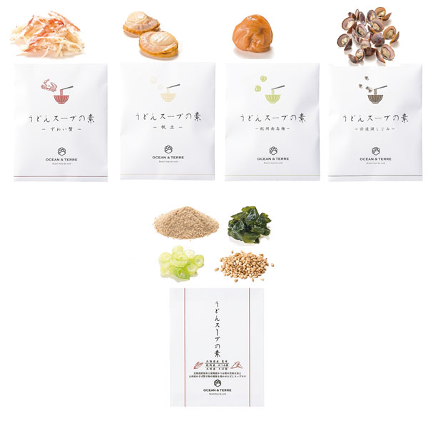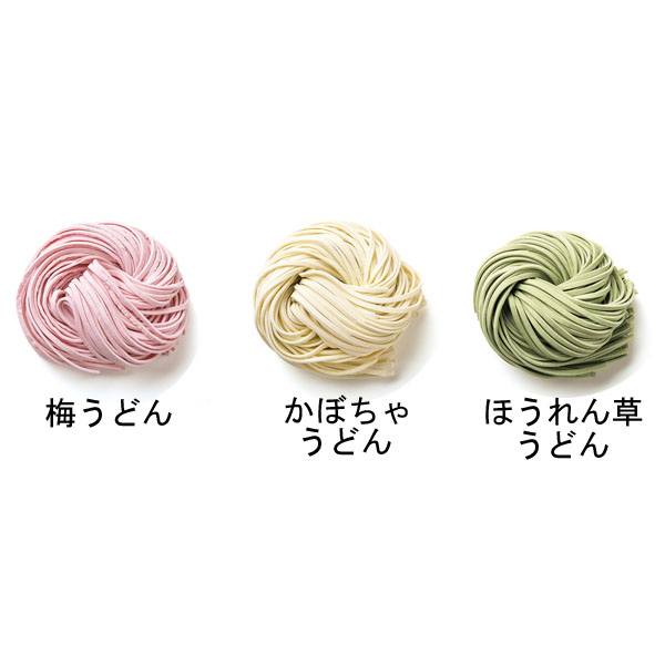 ●内容品:梅うどん丸麺70g×2、ほうれん草うどん丸麺70g・かぼちゃうどん丸麺70g・うどんスープの素(ずわい蟹15g・帆立2個入・紀州南高梅1粒・宍道湖しじみ)各1、(うどんスープ素7g・白煎りごま1g入)×各4