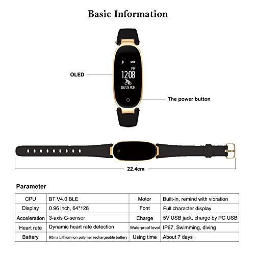 Specifications: -CPU:M0V4.0 BLE -Display:0.96 inch. -Material:Aluminium Plastic Body,TPU Thermoplastic Elastomer Strap and Stainless Steel Buckle -Acceleration:3-axis G-sensor -Battery:90ma Lithium polymer rechargeable battery -Font:Full display -Charge:5V USB jack -IP Grade:IP67 -Standby time:About7days.