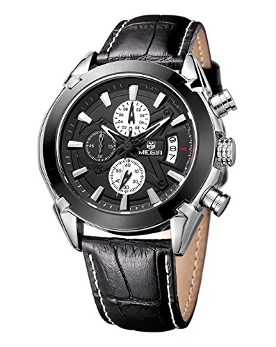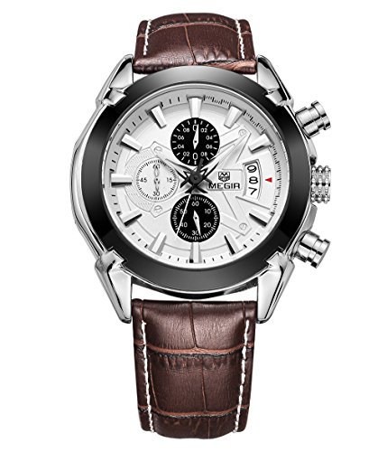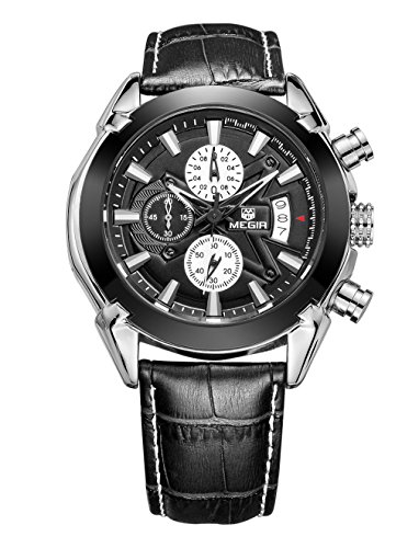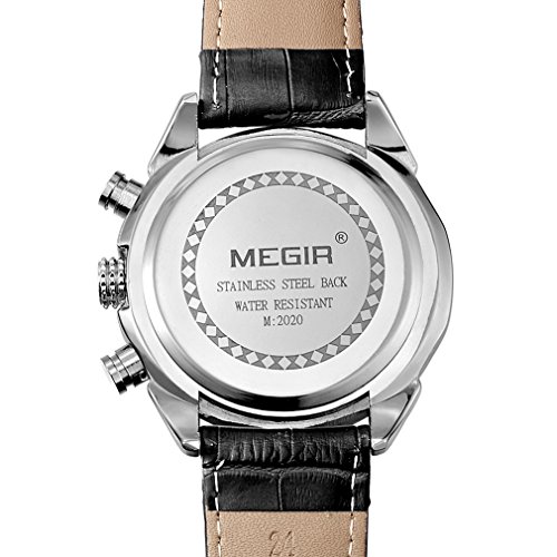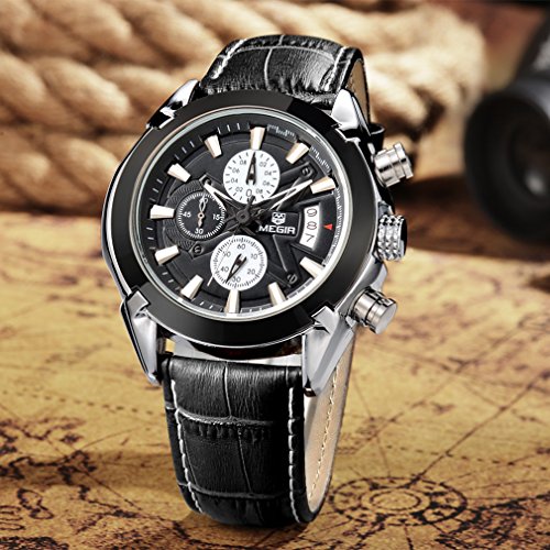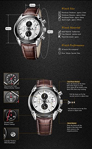-. Feature : Quartz movement with analog display,calendar, and chronograph function / 3 workable sub-dials for chronograph minute,chronograph second,24 hours function / Sport Military outlook shape. / Water resistant to 30m(99 ft),not for swimming / Leather Band watch band,stainless steel back,alloy case.