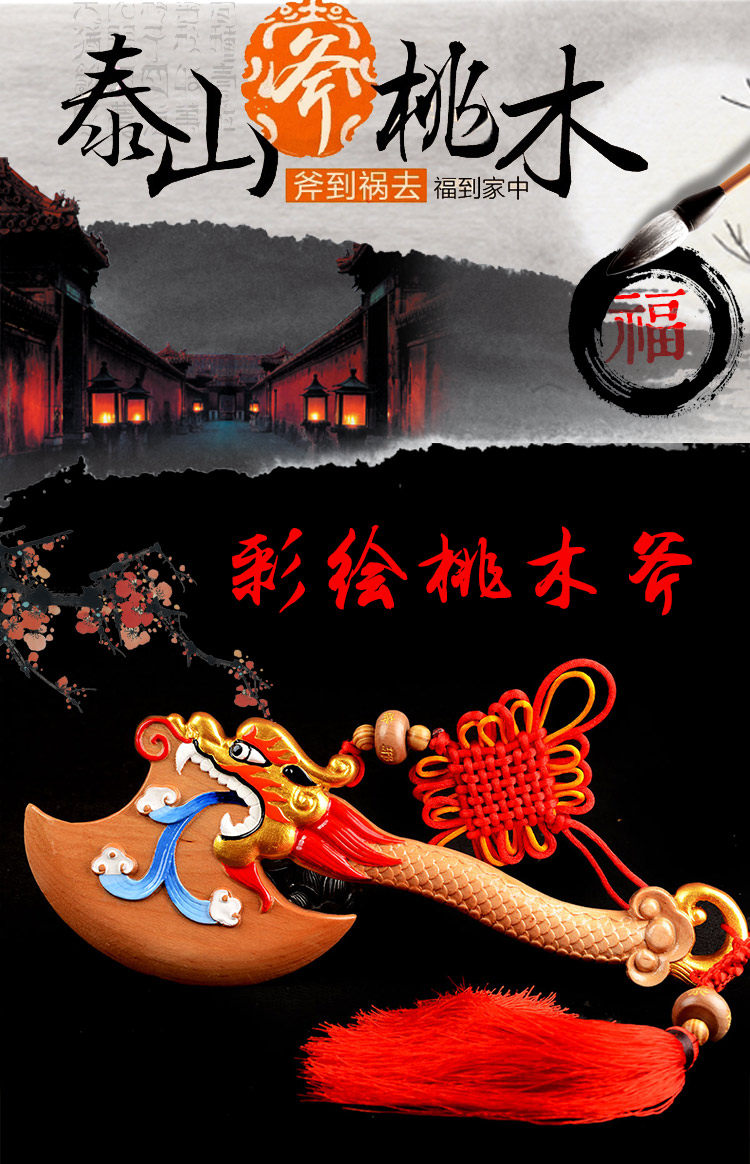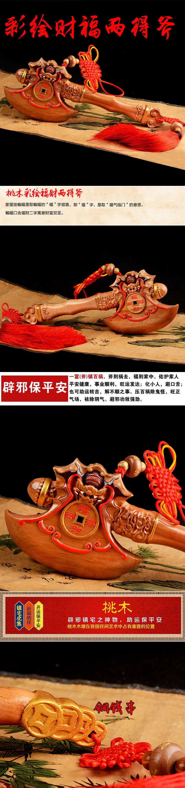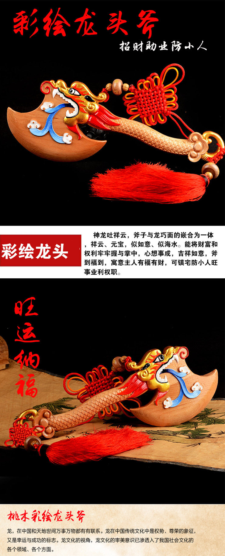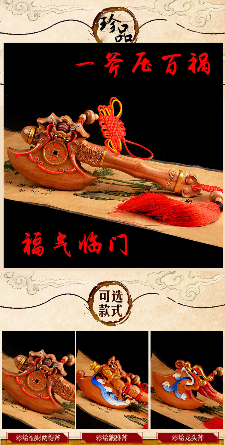 风水桃木斧子精雕彩绘龙头蝙蝠貔貅木雕挂件