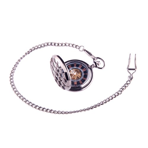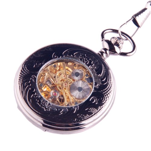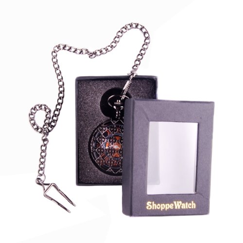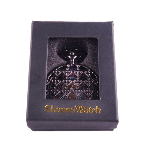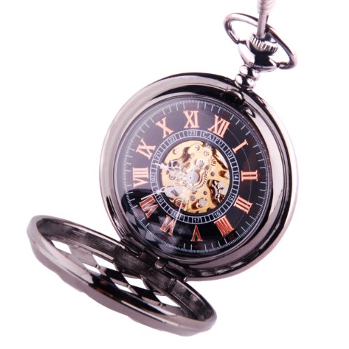 -. Feature : Half Hunter Pocket Watch with a Black Metal Case / Hand Wind Up Mechanical Movement - Skeleton Dial / Great Steampunk Watch. Cosplay Accessory. / With Metal Chain, Length: 365mm (14 inches) / ShoppeWatch Brand with Gift Box