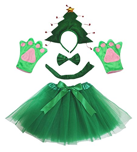 -. Feature : Product includes: headband, bow tie, tail, pair of paws, tutu. / Lightweight polyester material. / Sested for 2-5 years girl. / Adjustable covered waistband. / Xmas tree costume for children.