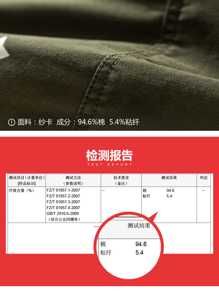 | 面 料:94.6%棉 5.4%粘纤颜 色:军绿 |