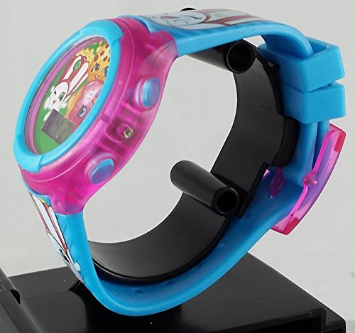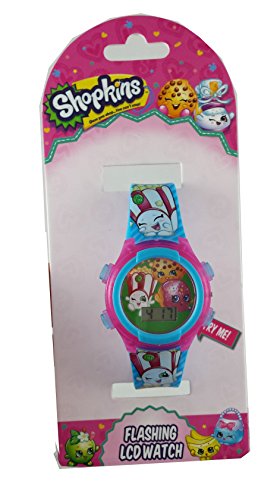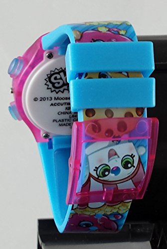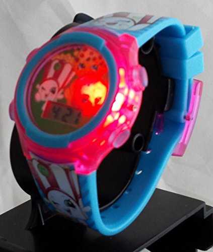 This is a really nice kids watch. It lights up in green,red and yellow for 10 seconds with the push of the right corner button. The band adjusts from 5.5-8 inches with 8 holes on the band and a buckle clasp that will fit your child's wrist perfectly. The band also has Shopkins graphics along the entire lengthFeature