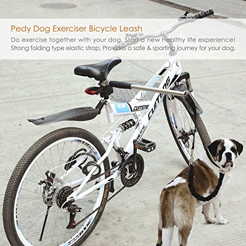 Great for you and your dog to be safe while you ride a bike. Cycle leash is the safest way to exercise your dog. Using hands free bicycle dog leash helps the dog to correct its pace and posture. Enjoy your shock-less ride in total safety with gain full control of your bike. FEATURES: The material is durable metal stainless steel . Metal Length: 17.9 inch, diameter: 0.8 inch; Leash length: 22 inches and can stretch up to 35 inches; Whole product can stretch up to 55 inch. Can be fixed on the bicycle easily. Giving dogs a perfect amount of lead to maintain a comfortable pace during every stroll.