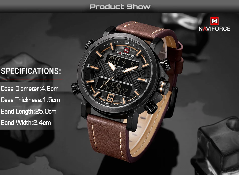 Feature:Stop Watch,Back Light,LED display,Repeater,Complete Calendar,Water Resistant,Alarm,Week Display