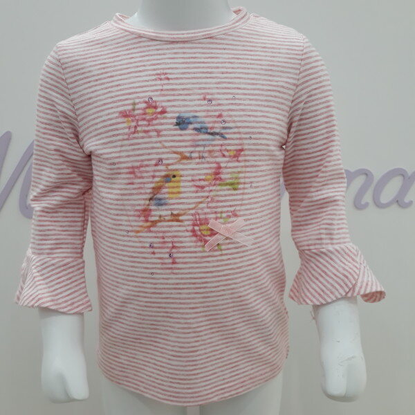 은은한 핑크메란 스트라이프의 티셔츠입니다. 간절기에 활용도가 높은 7부 소매에 소매끝은 튤립 휴레아 디자인으로 캐츄얼하지만 여성스러운 분위기의 티셔츠입니다. 기본핏에 소재를 사용해서 활동하기에도 편안합니다. 가슴의 파스텔톤의 새 프린트 포인티가 심플한 티셔츠에 특별함을 더해줍니다.