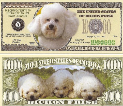 Studio : www.AmericanArtClassics.com Publisher : www.AmericanArtClassics.com Binding : Toy Product Description Bichon Frise Dog $Million Dollar$ Novelty Bill Collectible. These bills are the same size and feel of real money. They are finely detaileds and colorful on both front and back with high quality printing. Makes a great gift, collectible or frame and display. Price listed is for 1 bill. Buy as many as you want, still FREE SHIPPING!! Please visit my store for nearly 100 novelty bill styles. All orders shipped within 24 hours 0
