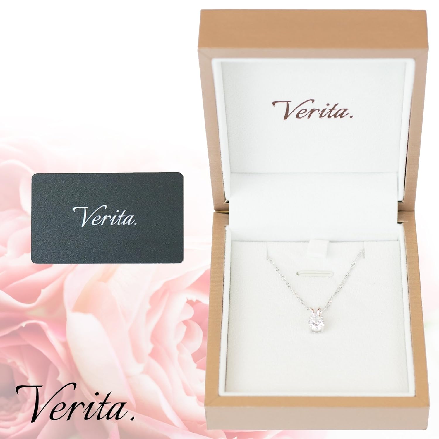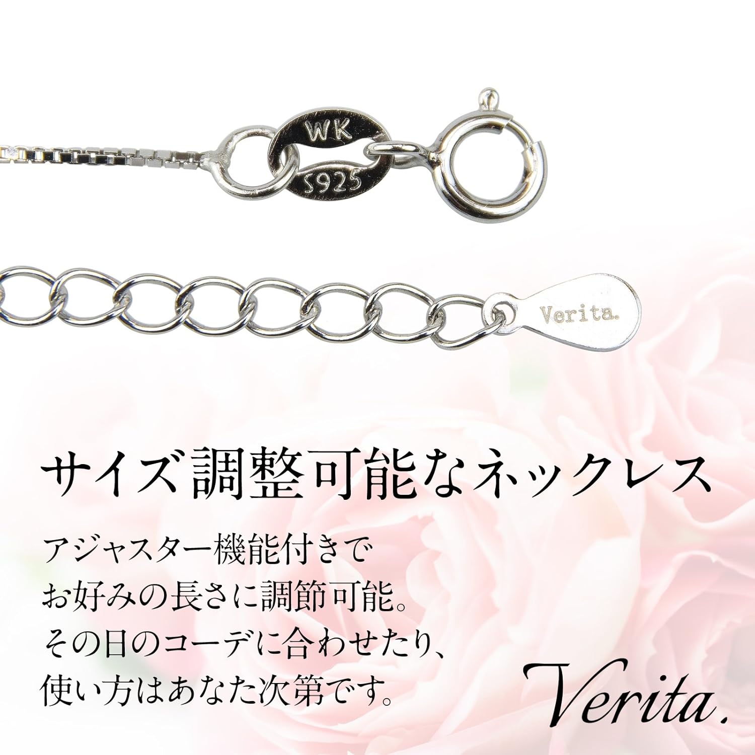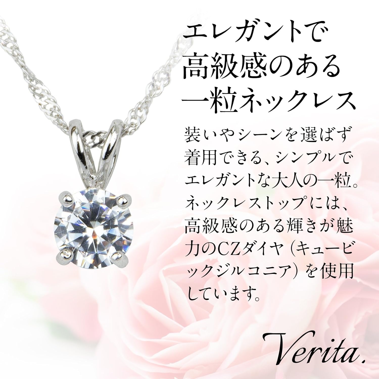 トップサイズ:縦約1.3cm、横約0.6cmチェーンの長さ:40〜45cm(留め具の位置でサイズ調節可能)付属品:Verita.ギャランティーカード、専用収納BOXVerita.ロゴのない類似品にご注意ください。高級感のある輝きと光沢で、肌触りも良く、末長くご愛用いただけます。