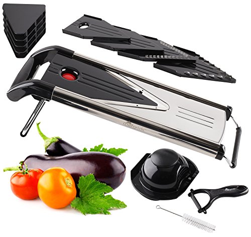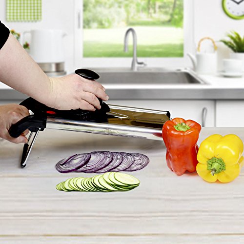 ADJUST THE SLICING THICKNESS ON THE SPOT: Thanks to our 5 different inserts, you can now cut and slice fruit and vegetables in any size and thickness you want! Our set includes a 3mm julienne, 7mm julienne, 1.5mm slicer, 2.5mm slicer, 3.5mm chip slicer. Slice like a pro and make food prep fun again!