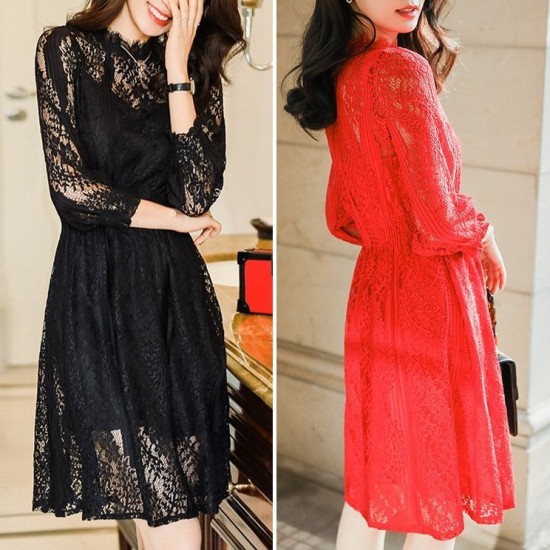 ワンピース ひざ丈 パーティードレス シースルー 透け感 フラワーレース ハイネック 大人 上品 クラシカル お呼ばれ デート drgz2270
