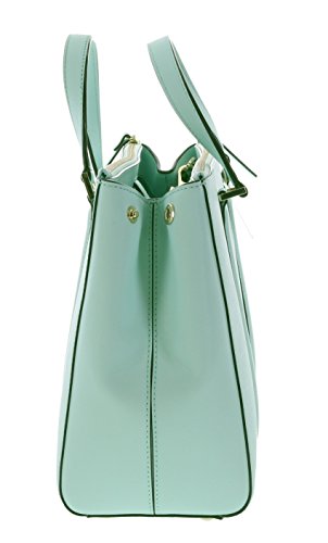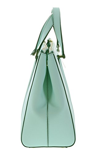 This is a sophisticated shoulder bag made from saffiano leather can be also be worn as crossbody with 14-karat gold tone hardware. The two outside compartments have a zip closure, the middle has a magnetic snap with multifunctional pockets. Shoulder strap is about at a 5"drop with a longer crossbody strap that is detachable and adjustable. Approximate measurement at 13.5" wide x 10" tall x 5" deep.Feature