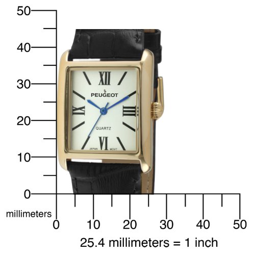 Make a statement with this tank shape case design from Peugeot- The classic eclectic Roman numeral dial markers are found on the most famous luxurious Swiss vintage brands. The vibrant black alligator embossed genuine leather band compliments any outfit. Whether you are in your weekend jeans or your business dress attire, you will look your best and projects the sign of success. The metallic blue hands gives it the added final touch.Feature