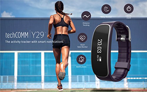 -. Title : TechComm Y29 Fitness Activity Tracker with Heart Rate Monitor, Bluetooth, Call and Text Notifications, Pedometer, Sedentary Reminder, Sleep Monitor, and Remote Camera