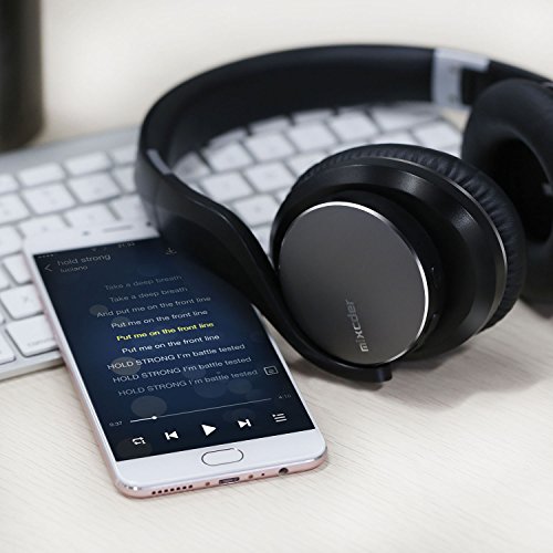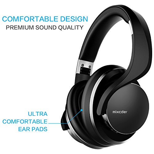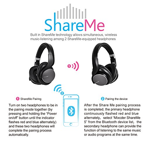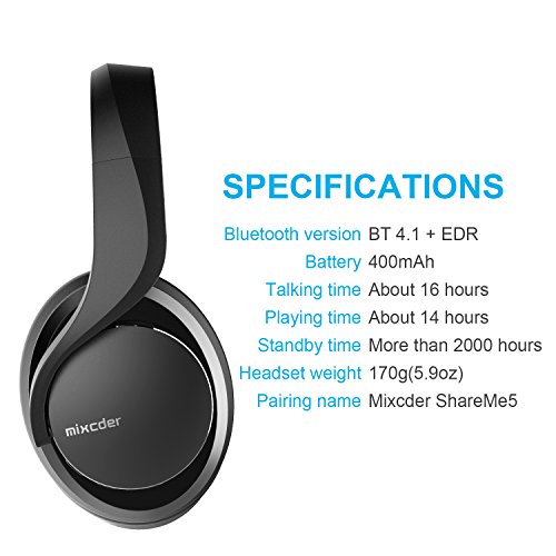 -. Feature : Unrivaled Powerful Bass Resonance of Mixcder:Its powerful and rich bass brings you amazing and unprecedented audio enjoyment. Bevel shaped and cavity-design speaker makes it 100% fit your ear, enhancing the sound quality with stronger dynamic range and sound stage. Ergonomic design gives you long time comfort. You will not be tired of long time wearing, and enjoy HIFI tone quality all the time. / Fashionable Appearance Headsets:Ergonomic design, adjustable headband, rotatable ear cups, protein leather of earmuffs are simulated to human skin texture - giving you long time comfort. Lightweight and foldable design makes it easy for travelling, storage or taking out.Built-in microphone and control buttons are located on the ear cups which allows you to control the volume and take phone calls directly / ShareMe Technology:Built-in ShareMe technology allows you to listen to music between 2 ShareMe-equipped headphones simultaneously. There won't be any noisy to you kids or family when you are watching movie or listening music with your parterner. / 4.1 Bluetooth Headphones + EDR Technology:The bluetooth transmission speed of ShareMe 5 is 3 Times / 2.1Mbps higher than normal bluetooth headphones and the battery will work up to 16 hours for talking, and 14 hours for listening music. The lightweight headphone can work in complicated environment when you are in travel or exercise. / Long Time Battery Life:Listen all day, charge at night. The built-in rechargeable li-ion battery powers the ShareMe 5 for a generous, best-in-class 16-hours of play time. And on the occasion that you find yourself without power, use the included 3.5mm aux cable to play passively.
