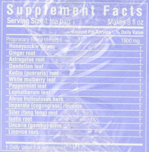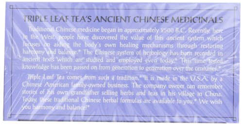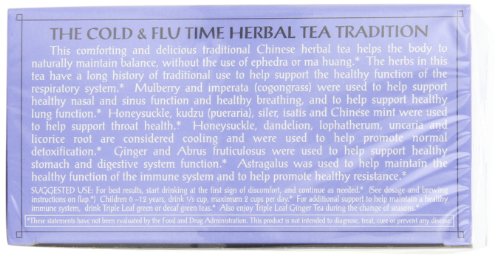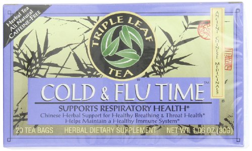 -. Binding : Grocery -. Brand : Triple Leaf Tea -. EAN : 0023991000057 -. Feature : Chinese herbal support for healthy breathing and throat health / Helps maintain a healthy immune system / The herbs in this tea have a long history of traditional use to help support the healthy function of the respiratory system / Helps the body to naturally maintain balance / Naturally supports respiratory health -. Label : Triple Leaf -. LegalDisclaimer : Actual product packaging and materials may contain more and different information than what is shown on our website. We recommend that you do not rely solely on the information presented and that you always read labels, warnings, and directions before using or consuming a product. Please see our full disclaimer below. -. Manufacturer : Triple Leaf -. Model : 764217 -. MPN : 023991000057 -. NumberOfItems : 6 -. PackageQuantity : 6 -. PartNumber : 023991000057 -. ProductGroup : Grocery -. ProductTypeName : GROCERY -. Publisher : Triple Leaf -. ReleaseDate : 2006-11-13 -. Size : 20 BAG -. Studio : Triple Leaf -. Title : Triple Leaf Tea Bags, Cold & Flu Time, 20 Count (Pack of 6) -. UPC : 023991000057