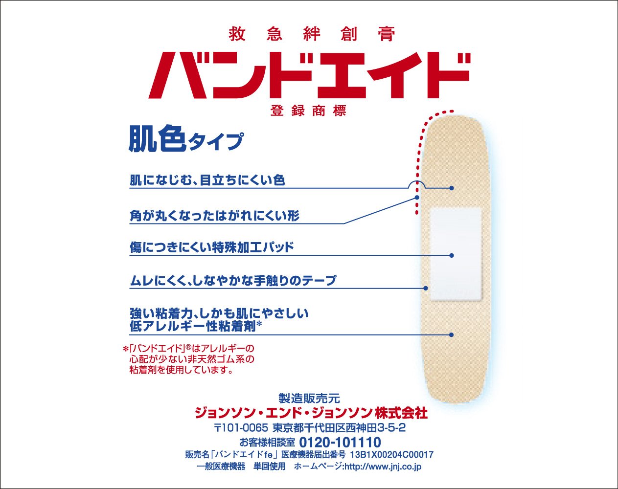 "Band-Aid 2003 Skin Color Standard 150 Sheets" is a soft, breathable, unobtrusive skin-tone emergency adhesive bandage.