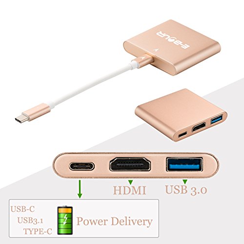 -. Binding : Electronics -. Brand : E-BOUR -. Color : Golden -. EAN : 6934215701985 -. Feature : ※ PERFECT MATCH: Aluminum Housing of this USB-C Hub to HDMI matches with your New Macbook elegantly / ※ MULTIFUNCTIONAL USE: Seperate Cable Design makes connecting more stable, the seperate can be used as USB-C converter cable seperately / ※ SUPER USB: 1 SuperSpeed USB 3.0 port transfer data up to 5Gbps, Allow you to connect an external keyboard, mouse, or USB flash drives / ※ 4K HDMI DISPLAY: A HDMI output mirrors your laptop's display (supports 4K) on any HDMI-enabled device. / ※ QUALITY GUARRANTEE: Product with E-BOUR trademark is guaranteed for 1 warranty and new replacement for any problem within amazon return policy -. Label : E-BOUR -. Manufacturer : E-BOUR -. Model : EB-PDHUB20G -. MPN : 6427115 -. PackageQuantity : 1 -. PartNumber : 6427115 -. ProductGroup : PC Accessory -. ProductTypeName : COMPUTER_COMPONENT -. Publisher : E-BOUR -. Studio : E-BOUR -. Title : E-BOUR USB-C Hub Digital AV Multiport Adapter USB3.1 Type-C to 1 HDMI 1 USB 3.0 port PD hubs 1 charging power delivery port Aluminum Housing for 12inch Apple New MacBook ChromeBook Pixel Gold
