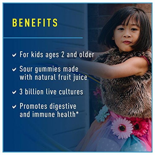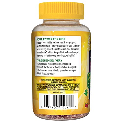Hello Sour Power! Ultimate Flora Probiotic Sour Gummies are coated with sweet and sour flavor for a fun and delicious way to replenish your good bacteria every day with 2 or 3 billion live cultures per serving. They are formulated with an advanced B. coagulants probiotic strain that survives harsh stomach acid to help ensure optimal delivery of good bacteria to the intestinal tract where they help promote digestive balance and support your immune health. Both children and adults will enjoy the delicious sour flavors of Ultimate Flora Probiotic Gummies. Made with natural fruit juice, they contain no sorbitol, and are free of GMOs, soy, dairy, eggs, shellfish, and added artificial ingredients. These statements have not been evaluated by the Food and Drug Administration. This product is not intended to diagnose, treat, cure, or prevent any disease. * These statements have not been evaluated by the Food and Drug Administration. This product is not intended to diagnose, treat, cure, or prevent any disease.Feature
