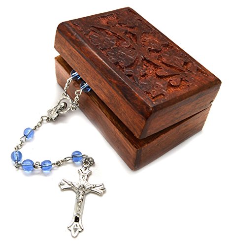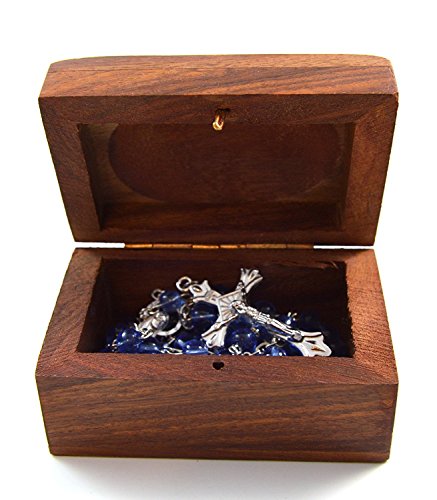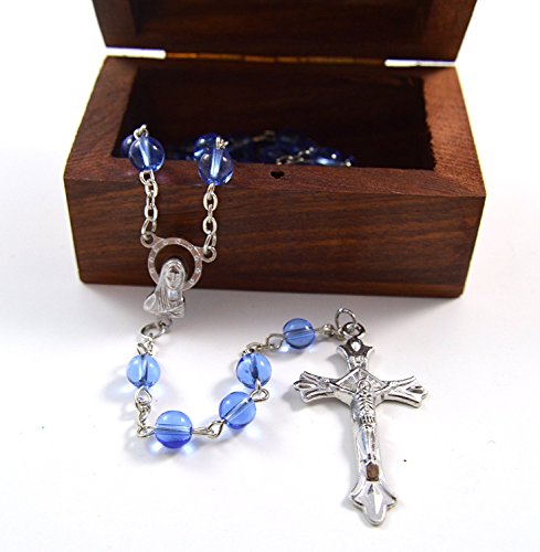 Catholic Blue Glass Prayer Beads Rosary Silver Plated Cross Crucifix Wooden Decorative Box