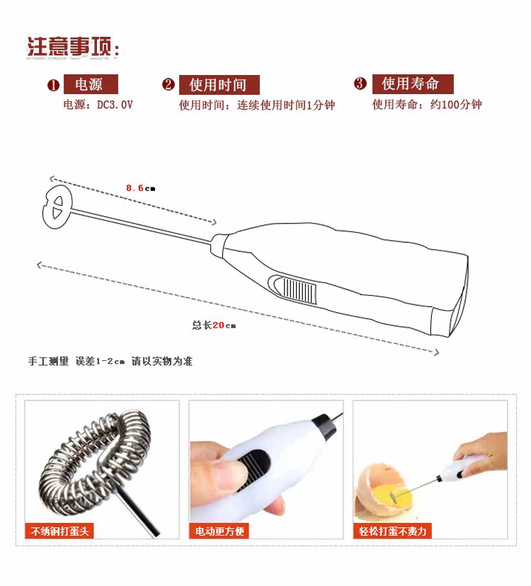 Stainless steel mixing head, powerful, easy to play whisk / coffee / light cream liquid, continuous use time of 1 minute (this is a convenient mini home, built-in motor normal life of