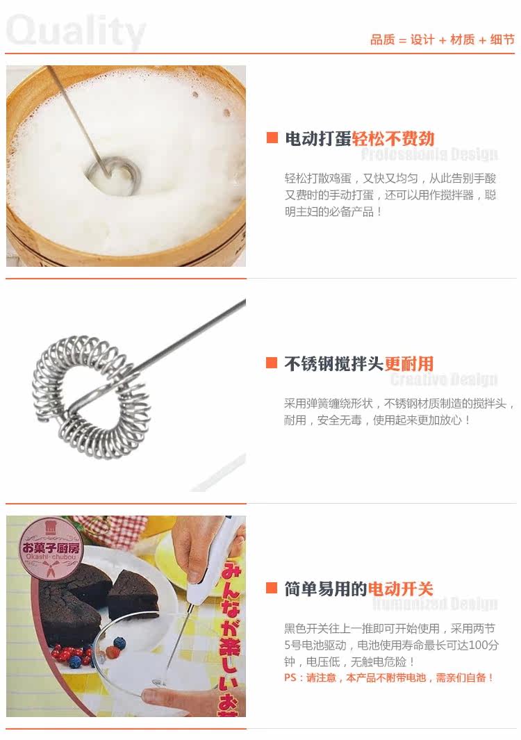 采用不锈钢搅拌头,动力十足,可轻松打蛋清/咖啡/淡奶油之类的液体,连续使用时间为1分钟(这款是家用便捷迷你型,内置电动机的使用寿命正常为100分钟)。