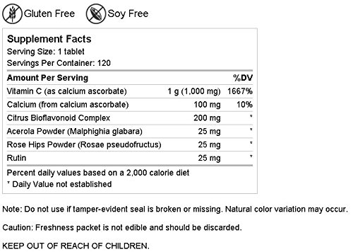 -. Feature : Buffered Vitamin C / With calcium, citrus bioflavonoid complex, acerola powder, rose hips powder and rutin / Supplement Facts: Serving Size: 1 tablet. Servings Per Container: 120.