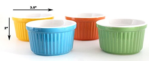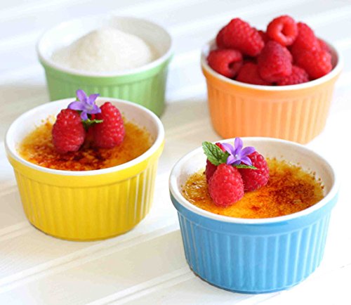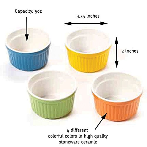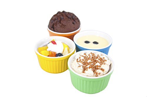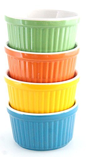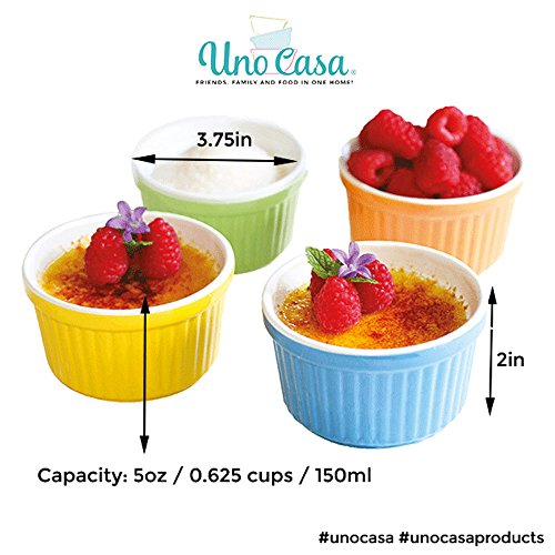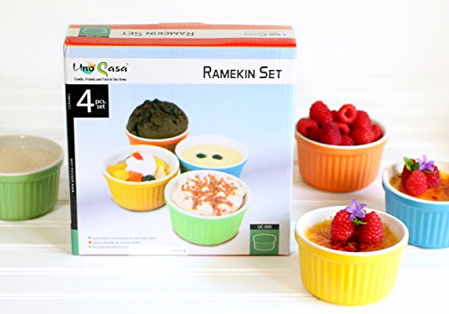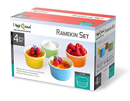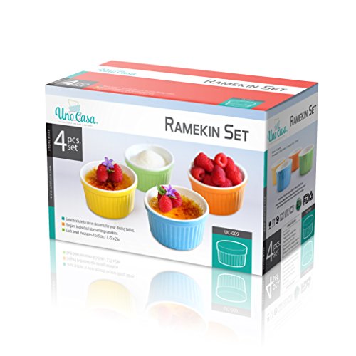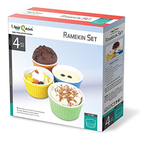 Studio : Uno Casa Publisher : Uno Casa Product Description When it comes to making desserts, what you serve in matters just as much as what recipes you use! Desserts that are presented in attractive ramekins certainly does the trick. The Uno Casa Colorful Ramekins makes this possible. In this handsomely designed and durably crafted set of ramekins, you'll find 4 x 5oz. Sleek Colorful Ramekin Dishes that are 3.75 inches in diameter and 2 inches deep. The ramekin dishes included in this stylish serving set can be used for any meal whether you're just serving your family or entertaining guests! When you're finished with the your tasty desserts, you can quickly hand wash ramekins and place it in the dishwasher for simple clean-up. They're durable stoneware ensures that they'll stand the test of time and provide you with many years of stylish desserts. The colorful finishes of the orange, green, yellow and blue ramekins make this baking dish set attractive enough to store anywhere in your kitchen if you wish! The Uno Casa Ramekins Baking Dishes are backed by a 30 day satisfaction guarantee and is truly the best set of ramekin baking dishes you'll find on Amazon! 0