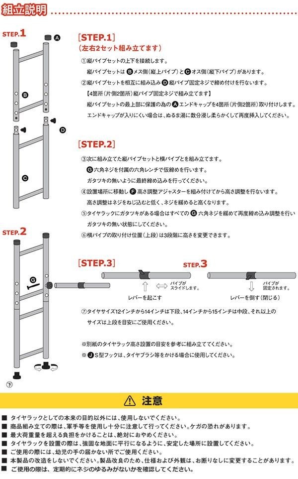 12~17インチまでのタイヤが収納可能!タイヤ幅に合わせて横幅が伸縮でき、タイヤ高さに合わせて棚の高さも3段階調整ができます。安全に配慮したスチールパイプ仕様で、純正タイヤ・スタッドレスタイヤの収納に最適です☆ |