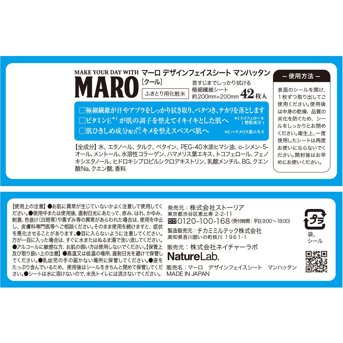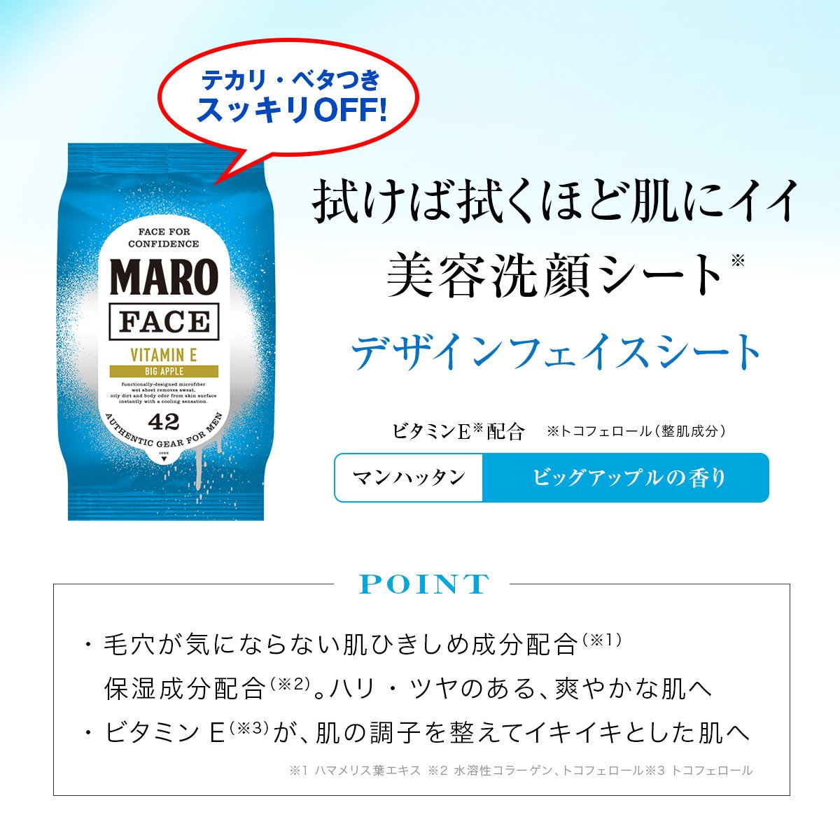 原産国:日本 内容量:42枚 全成分:水、エタノール、タルク、ベタイン、PEG-40水添ヒマシ油、o-シメン-5-オール、メントール、水溶性コラーゲン、ハマメリス葉エキス、トコフェロール、フェノキシエタノール、ヒドロキシプロピルシクロデキストリン、乳酸メンチル、BG、クエン酸Na、クエン酸、香料 スキンタイプ:全肌質対応