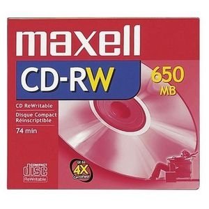 Studio : Maxell Publisher : Maxell Binding : Electronics Product Description Brand Name: Maxell Product Name: 4x CD-RW Media Marketing Information: A Rewritable Optical Disc that Works Like a Floppy Diskette. Packaged Quantity: 1 Package Type: Retail Packing: Slim Jewel Case Product Type: CD Rewritable Media Storage Capacity: 650 MB Maximum Recording Time: 1.23 Hour Maximum Write Speed: 4x Media Formats: CD-RW Form Factor: 120mm Weight (Approximate): 2.40 oz Limited Warranty: Lifetime 0