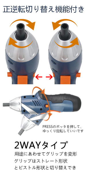 ストレートタイプとガンタイプの2WAY方式!PRESSのボッタを押して、ゆっくり旋転すると形が変わります。手前の作業しやすい場世ではガンタイプ、奥まった場所ではストレートタイプに切り替えるなど、場所に応じて形状を変形させて使えます。